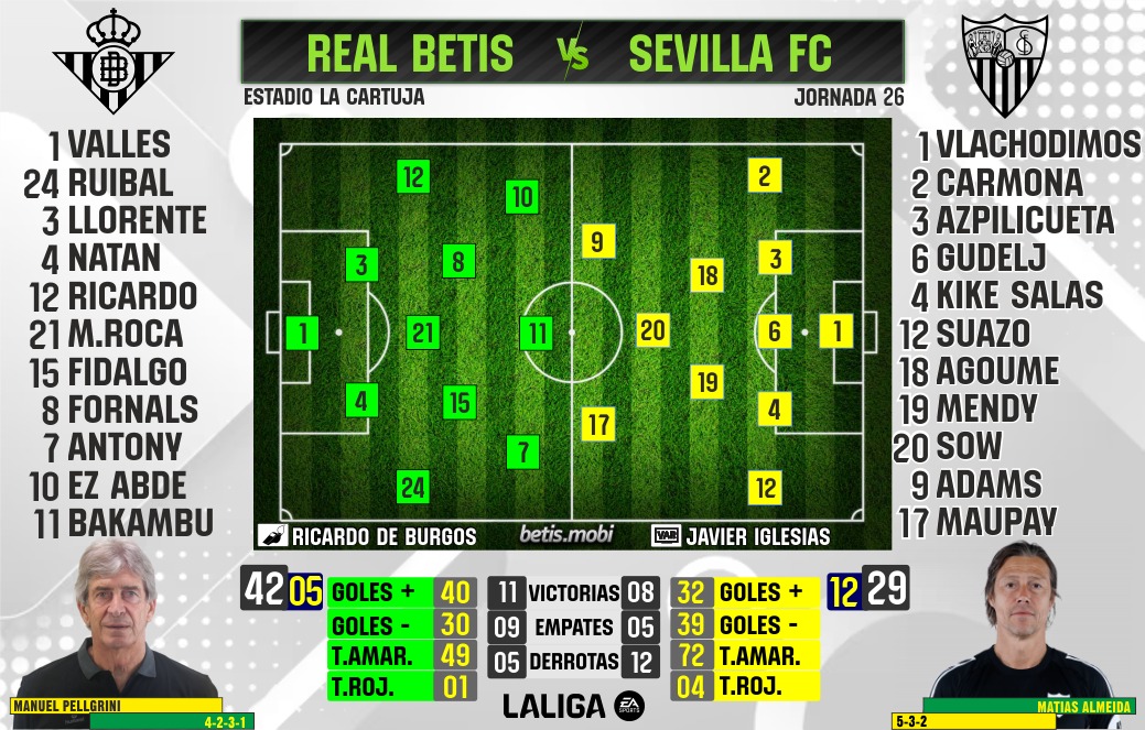 Ricardo De Burgos Bengoextea será el colegiado del encuentro, asistido en el VAR por Iglesias Villanueva. El árbitro bilbaíno ya sabe lo que es pitar un derbi sevillano. Ya lo hizo en el «derbi del palito», con todo lo que desencadenó después y que todos ya conocemos.