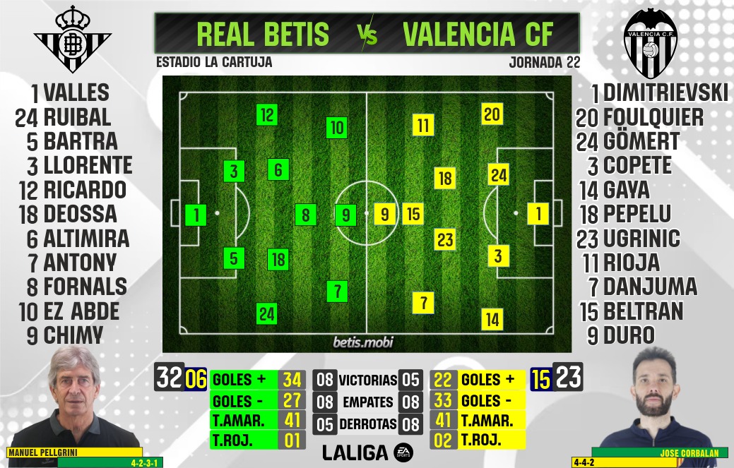 En cuanto a la dinámica de ambos equipos, el Valencia llega con un balance de dos victorias, dos empates y una derrota en sus últimos cinco partidos de Liga, mientras que los verdiblancos presentan números similares: dos triunfos, dos derrotas y un empate en el mismo número de encuentros.